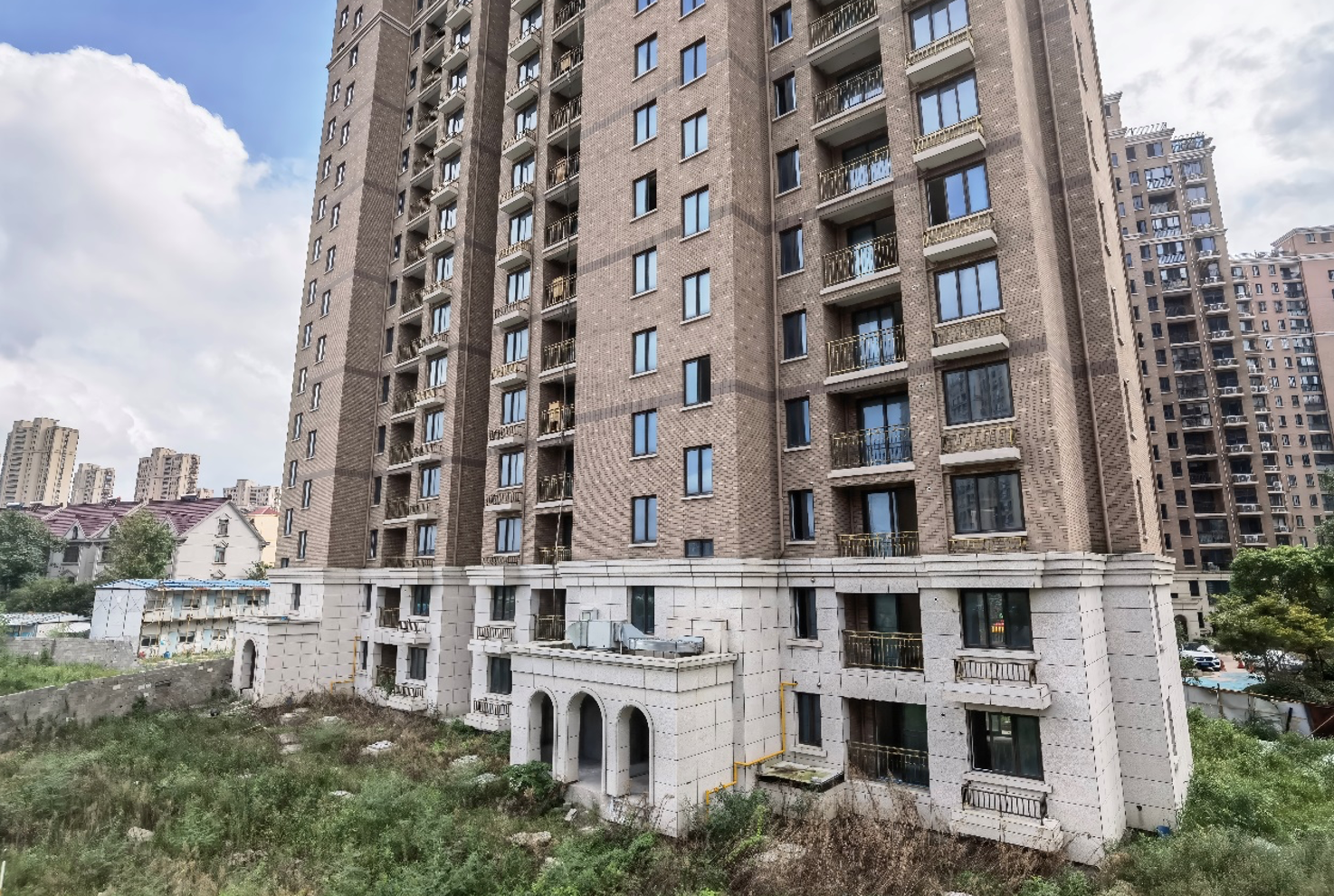 9月10日,时代周报记者走访三盛宏业位于浦东周浦的明天华城项目,发现原本应于8月31日交付的56#、57#两幢楼房四周杂草密布,并用围挡与已经交付的三期小区隔开,附近建筑工地则人去楼空。