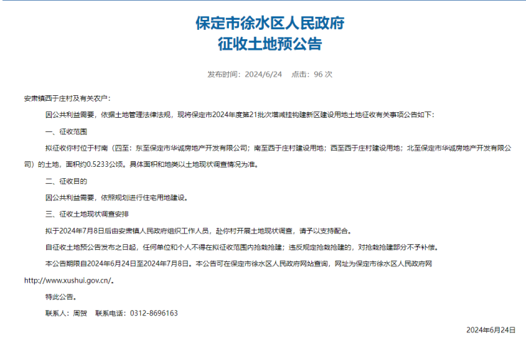 2024年6月24日,保定市徐水区政府公布最新征地公告。此次征收土地公告涉及安肃镇西于庄村,面积约0.5233公顷, 依照规划进行住宅用地建设。