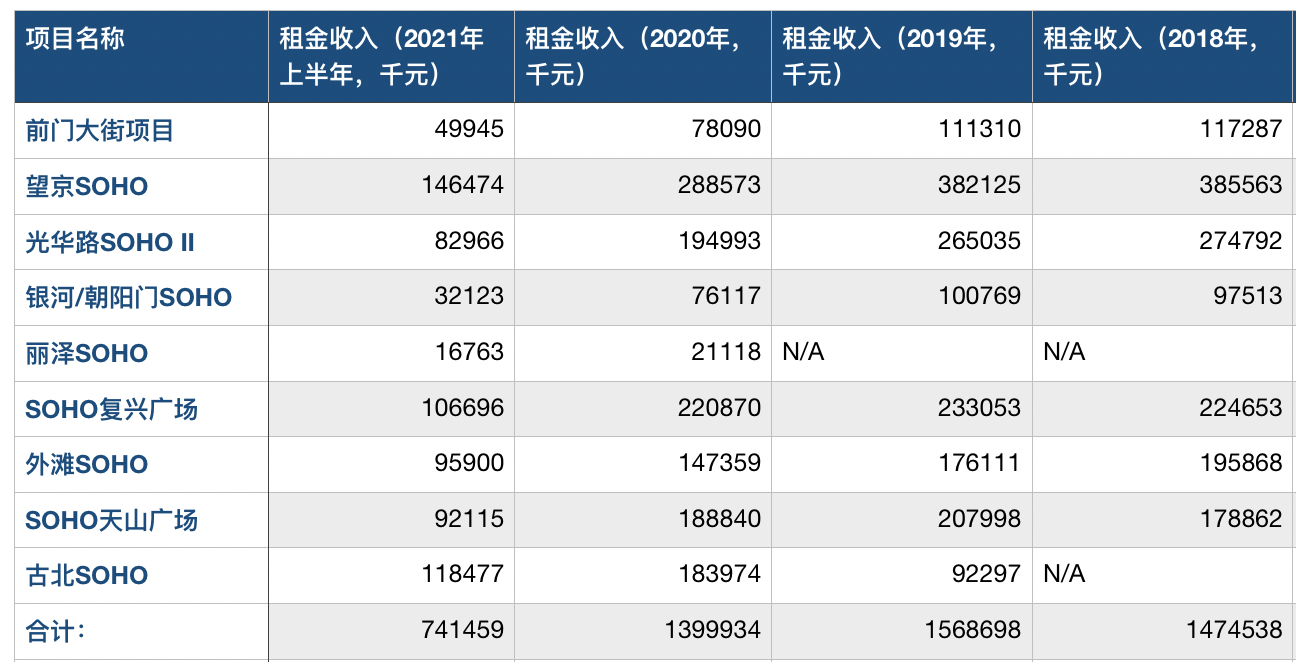 澎湃新闻整理了SOHO中国从2019年至2021年上半年的租金收入后发现,2018年SOHO中国已建成运营的项目有7个,租金收入就达14.74亿元;2019年已建成运营的项目为8个,租金收入15.68亿元;即使2020年受疫情影响,9个项目的租金收入还有13.99亿元。2021年上半年9个项目的租金收入7.41亿元。
