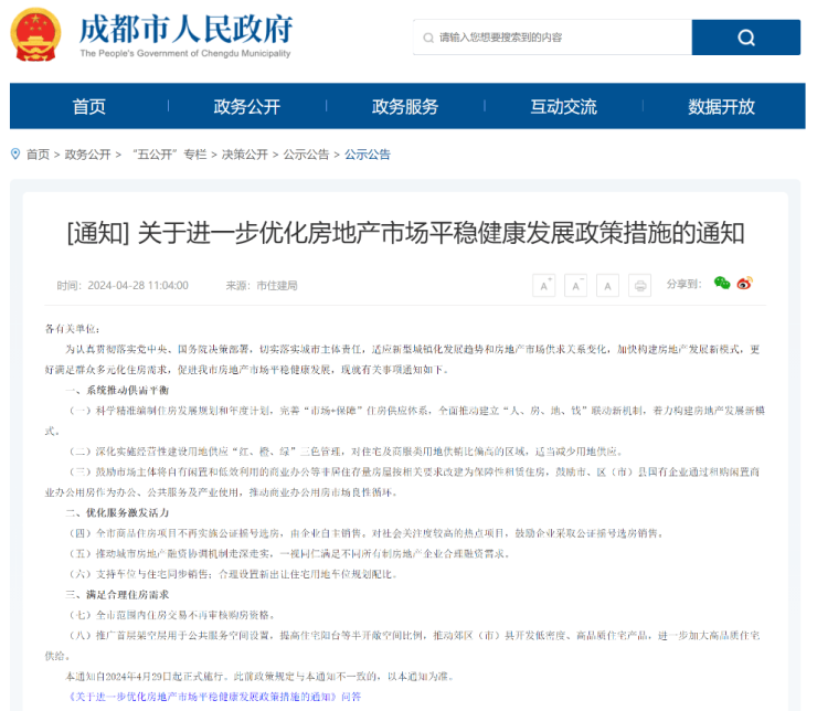 4月28日,成都市房地产市场平稳健康发展领导小组办公室发布《关于进一步优化房地产市场平稳健康发展政策措施的通知》(以下简称《通知》),自4月29日起,成都范围内住房交易不再审核购房资格,即今后成都买房不用再看社保、户口等购房资格,也不再限制购买套数。这也意味着,从2016年10月1日至今,历时7年半的成都限购政策成为过去式。
