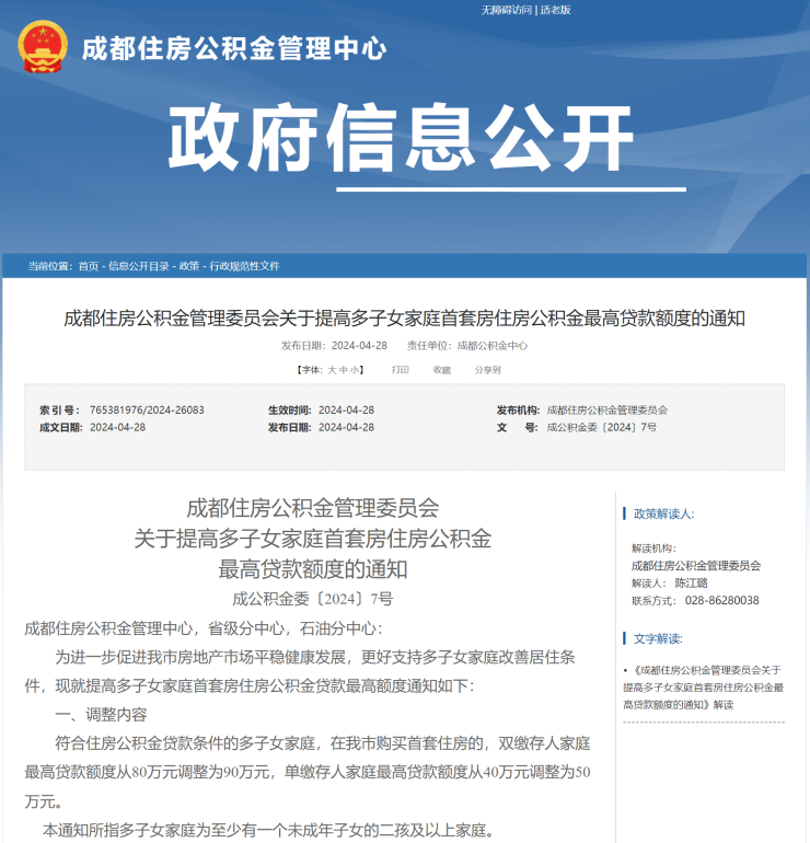 同日,成都住房公积金管理中心发布的《关于提高多子女家庭首套房住房公积金最高贷款额度的通知》指出,符合住房公积金贷款条件的多子女家庭,在成都市购买首套住房的,双缴存人家庭最高贷款额度从80万元调整为90万元,单缴存人家庭最高贷款额度从40万元调整为50万元。
