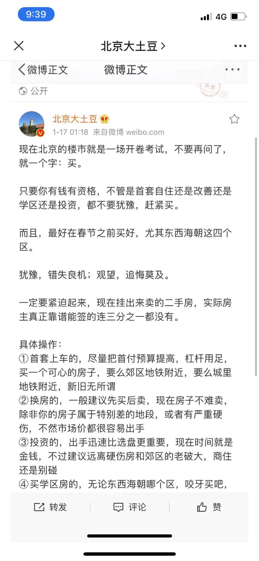 将北京楼市比喻成“开卷考试”的,是名为“北京大土豆”的自媒体。1月17日,“北京大土豆”在账号上推出了一篇聊房子的文章,直接劝说读者:“较好在春节之前买好,尤其东西海朝这四个区……一定要紧迫起来,现在挂出来卖的二手房,实际房主真正靠谱能签的连三分之一都没有。”