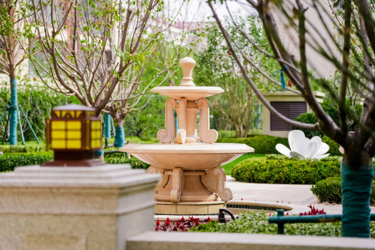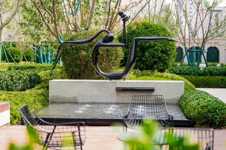 以玉兰雕塑为视觉焦点,四周樱花每年春日织锦成浪漫云霞。精致水景沿中轴流淌,水声潺潺与鸟鸣相和。这里遍植各色玉兰,盛绽时宛如一场静默的花海盛宴。休憩区的遮阳伞与休闲椅,为这片花园增添了度假般的闲适。晨起漫步,午后友邻小聚,孩子在不远处超400㎡的中心草坪上奔跑嬉戏,脚下特色铺装的纹路指引着归家方向——每一天,都将优雅酿成诗意日常。