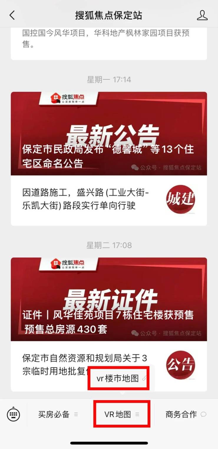 ②进入“搜狐焦点保定站”公众号首页,在底部“VR地图”点击进入,或者点击查看原文。