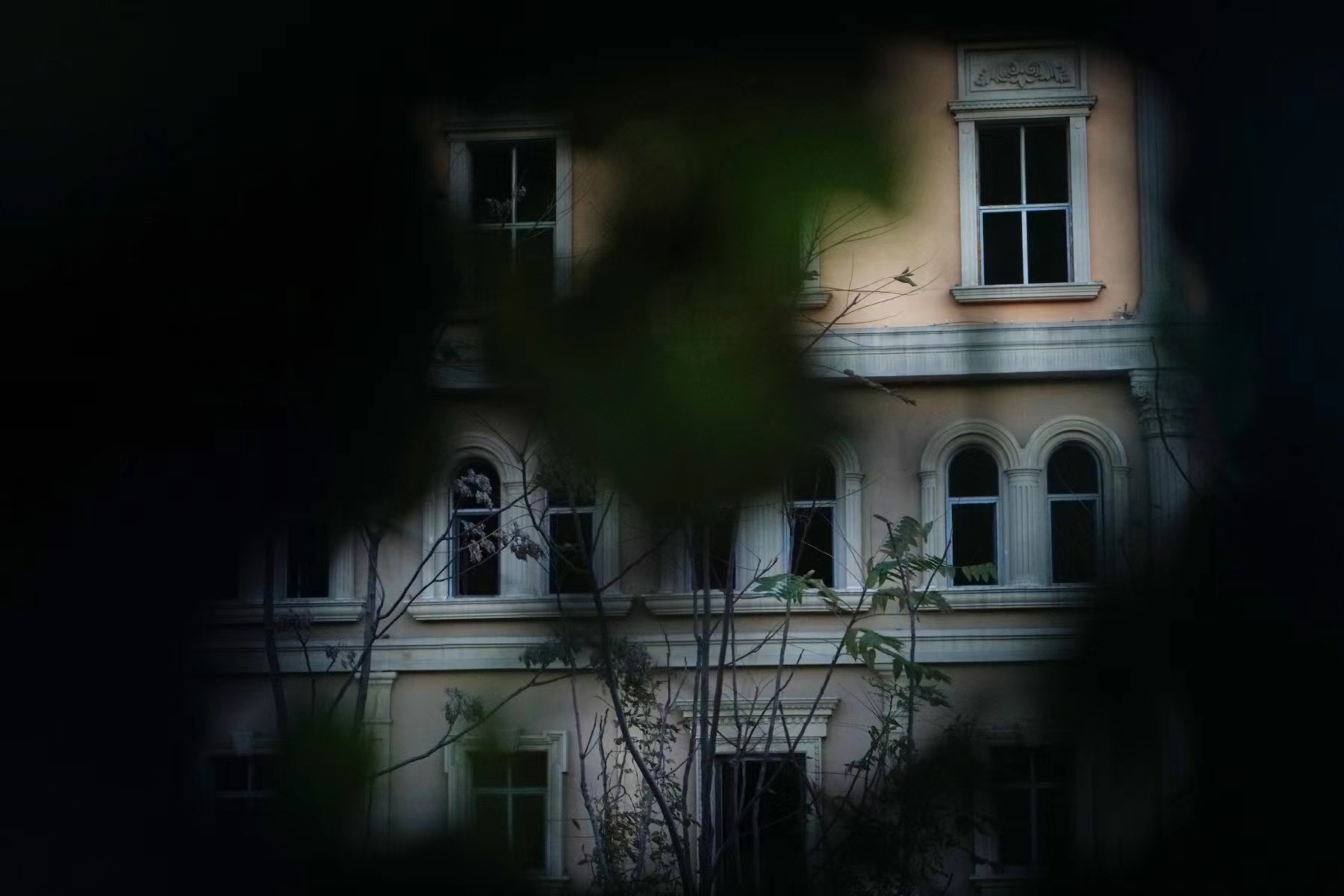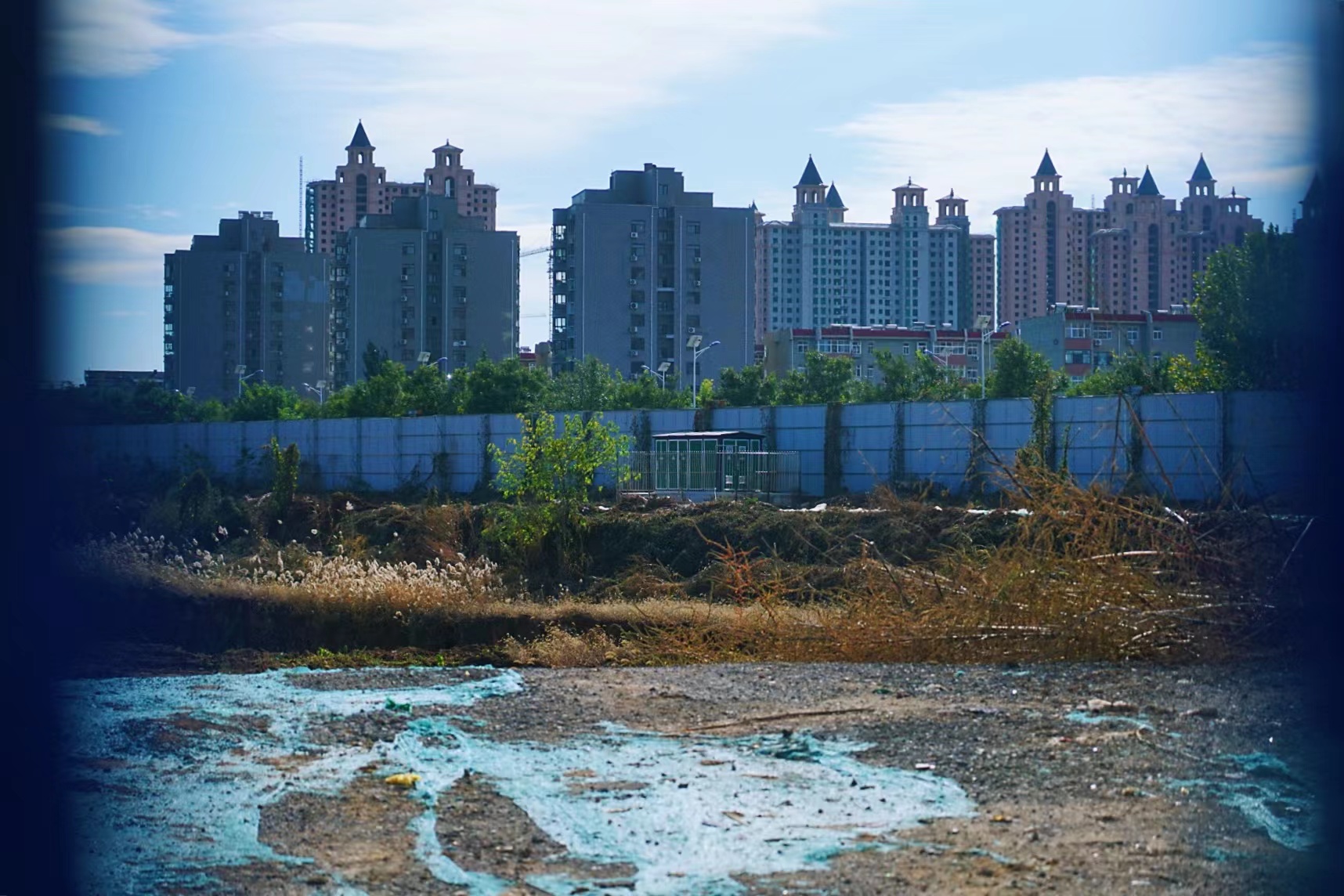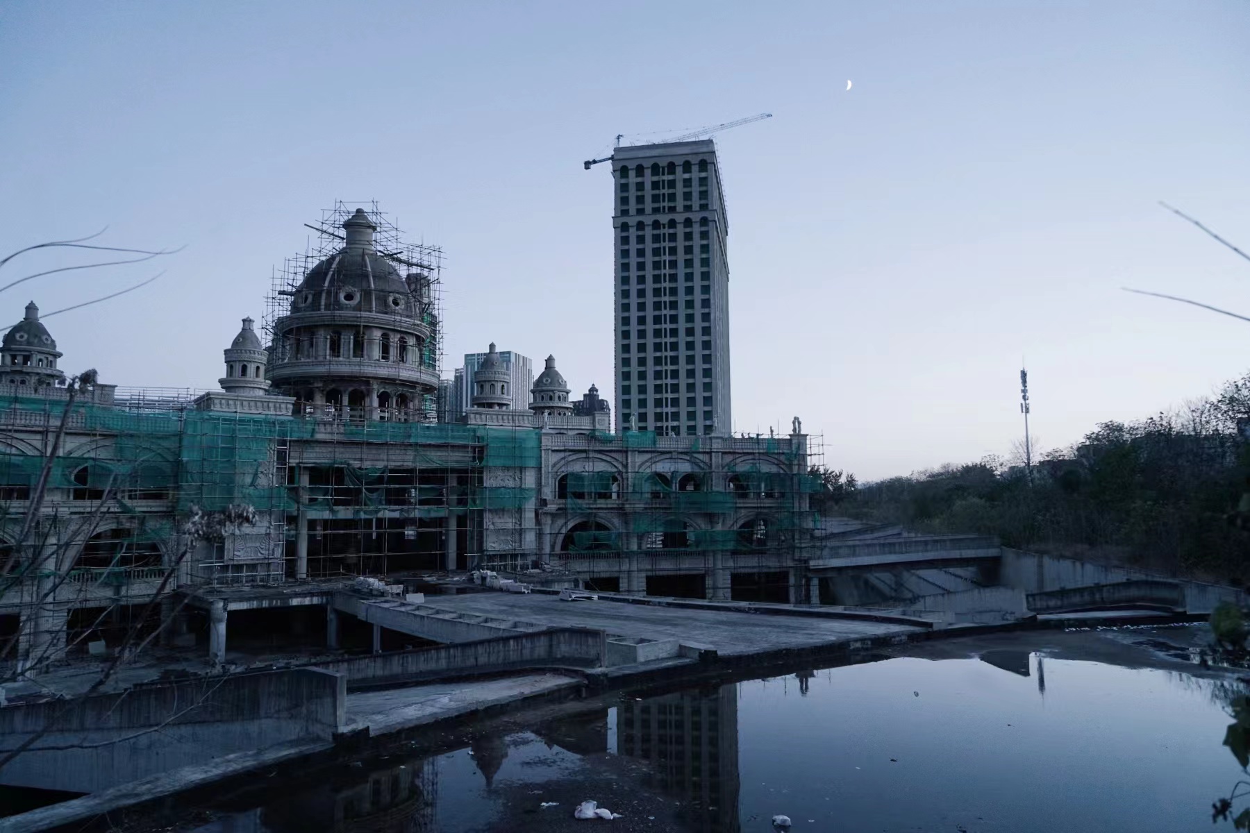 但是,越过蓝色围挡、看向建筑内部,多数人会被荒凉景象所震惊:毛坯建筑、钢筋水泥,硕大的多层商场渺无人迹。大约走半小时,转向建筑群背面,则会看到宛如末日将至时的城堡。傍晚,一辆运输车隆隆开过,月亮在工地污水上留下倒影。