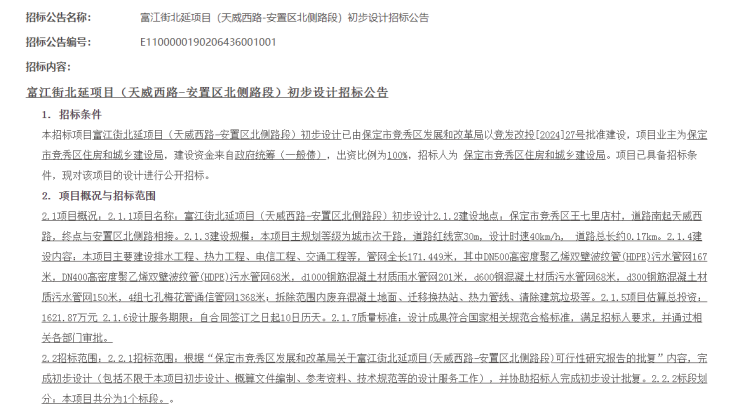 2024年7月22日,河北省招标投标公共服务平台发布富江街北延项目(天威西路-安置区北侧路段)初步设计招标公告。