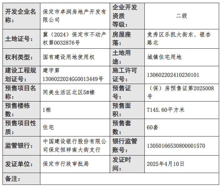 2025年4月10日,保定市行政审批局发布商品房预售许可证信息,春和景明项目5#楼获发预售,预售面积7145.60平方米,预售套数60套,预售证号(保)房预售证第2025008号。…