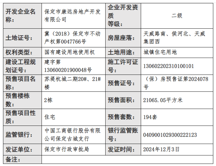2024年12月3日,保定市行政审批局公布了一则商品房预售许可证下发信息,苏堤杭城二期20#、21#楼获预售,预售面积21065.05平方米,预售套数194套,预售证号(保)房预售证第2024078号。