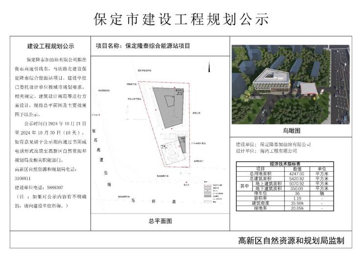 保定隆泰加油站有限公司拟在张石高速引线东,马坊路北建设保定隆泰综合能源站项目。建设单位己委托设计单位按城市规划要求,相关规定、建筑设计规范等进行方案设计,现将总平面图及主要效果图予以公示。