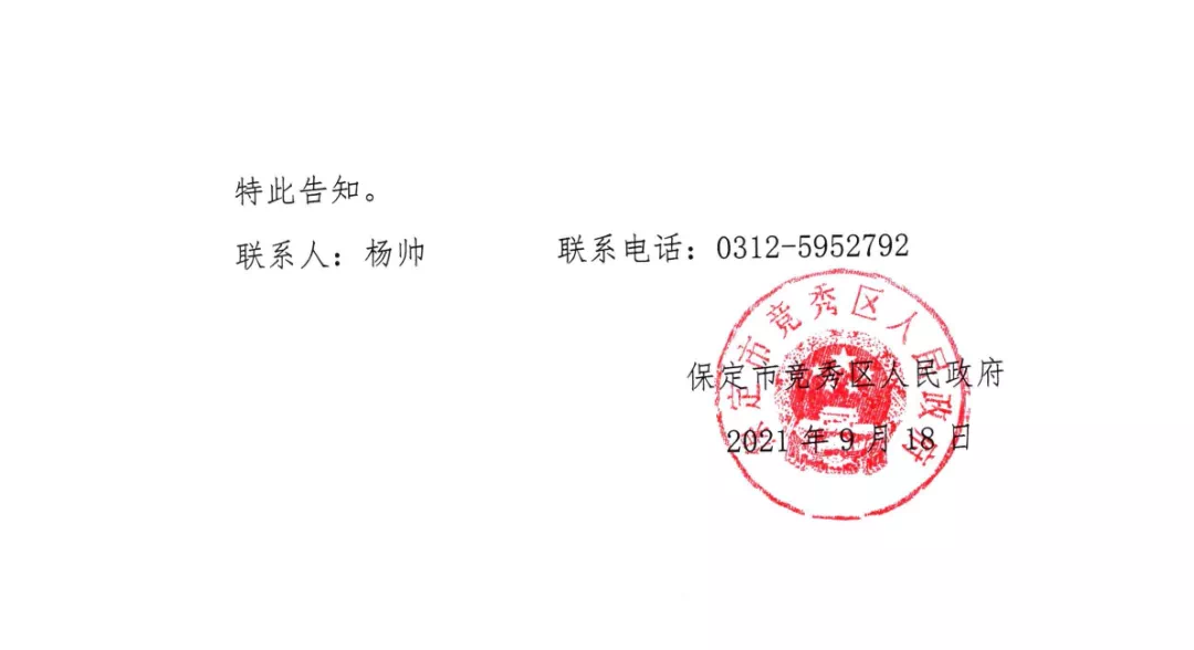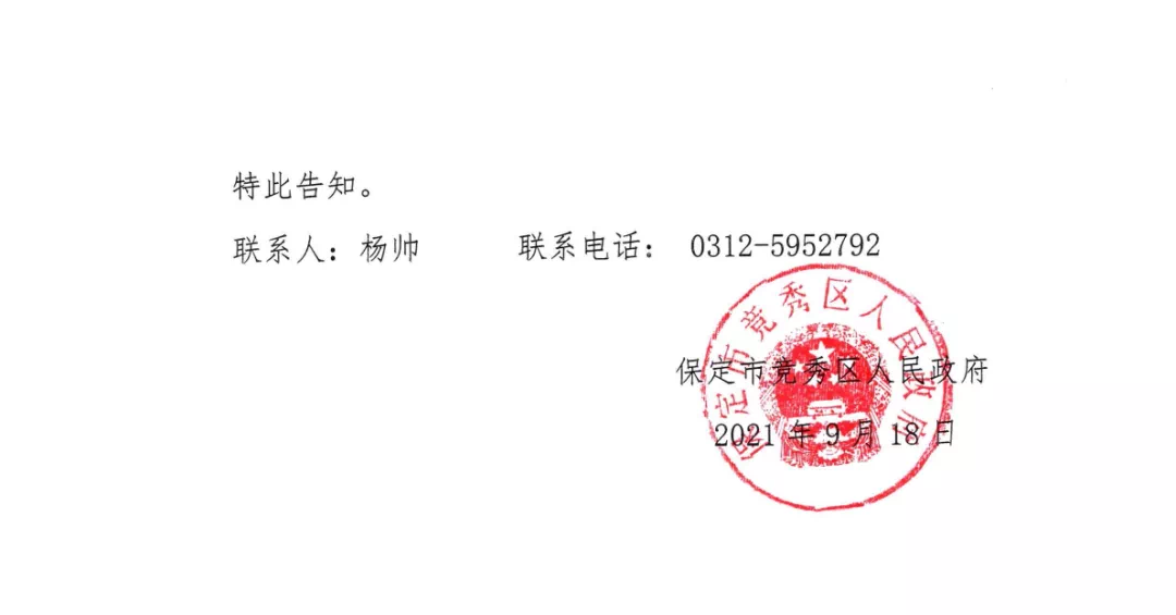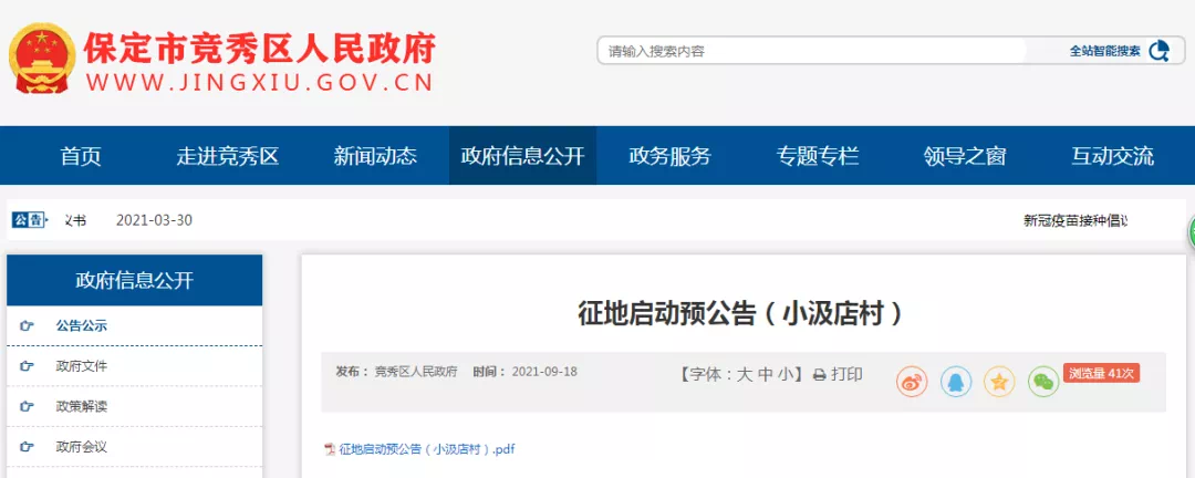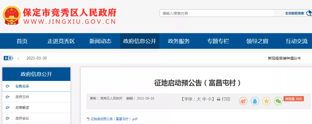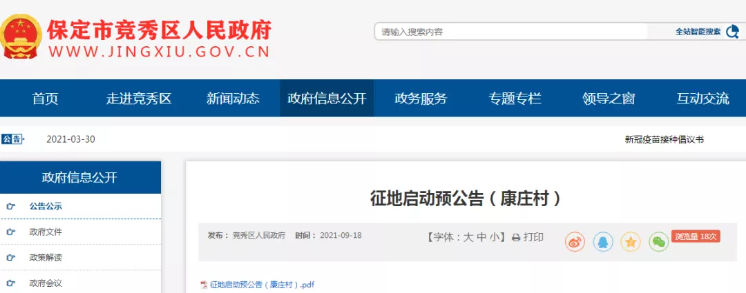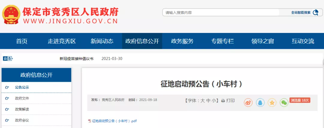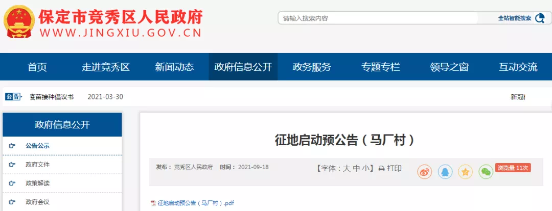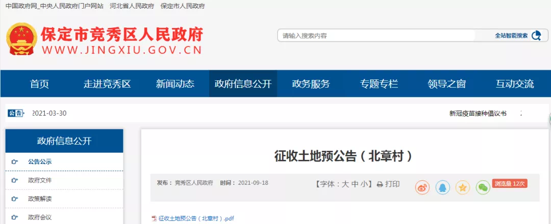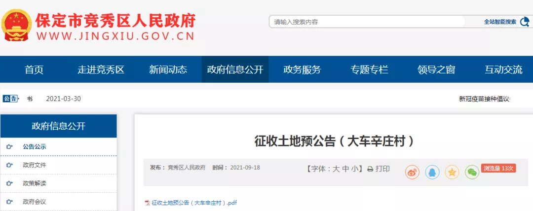 2021年9月18日,保定市竞秀区人民政府官网发布13则征收土地预公告,涉及北章村、崔闸村、大车村、大车辛村、大祝泽、富昌屯村、康庄村、鲁岗辛村、马厂、蛮子营村、南章村、小车村、小汲店村等。