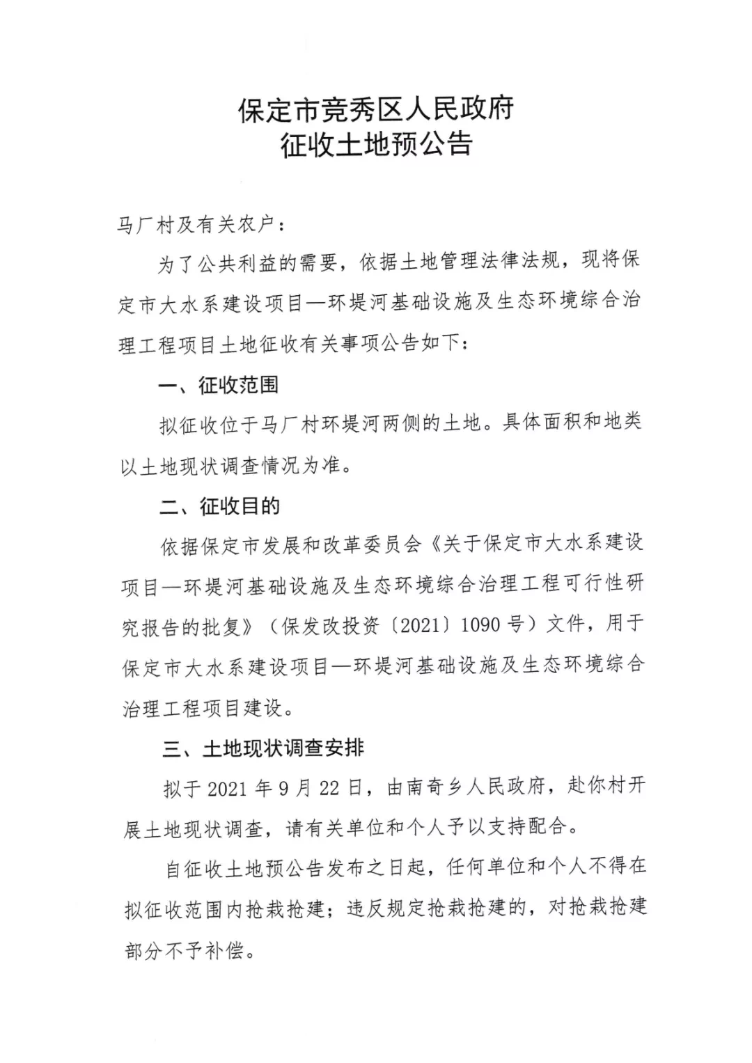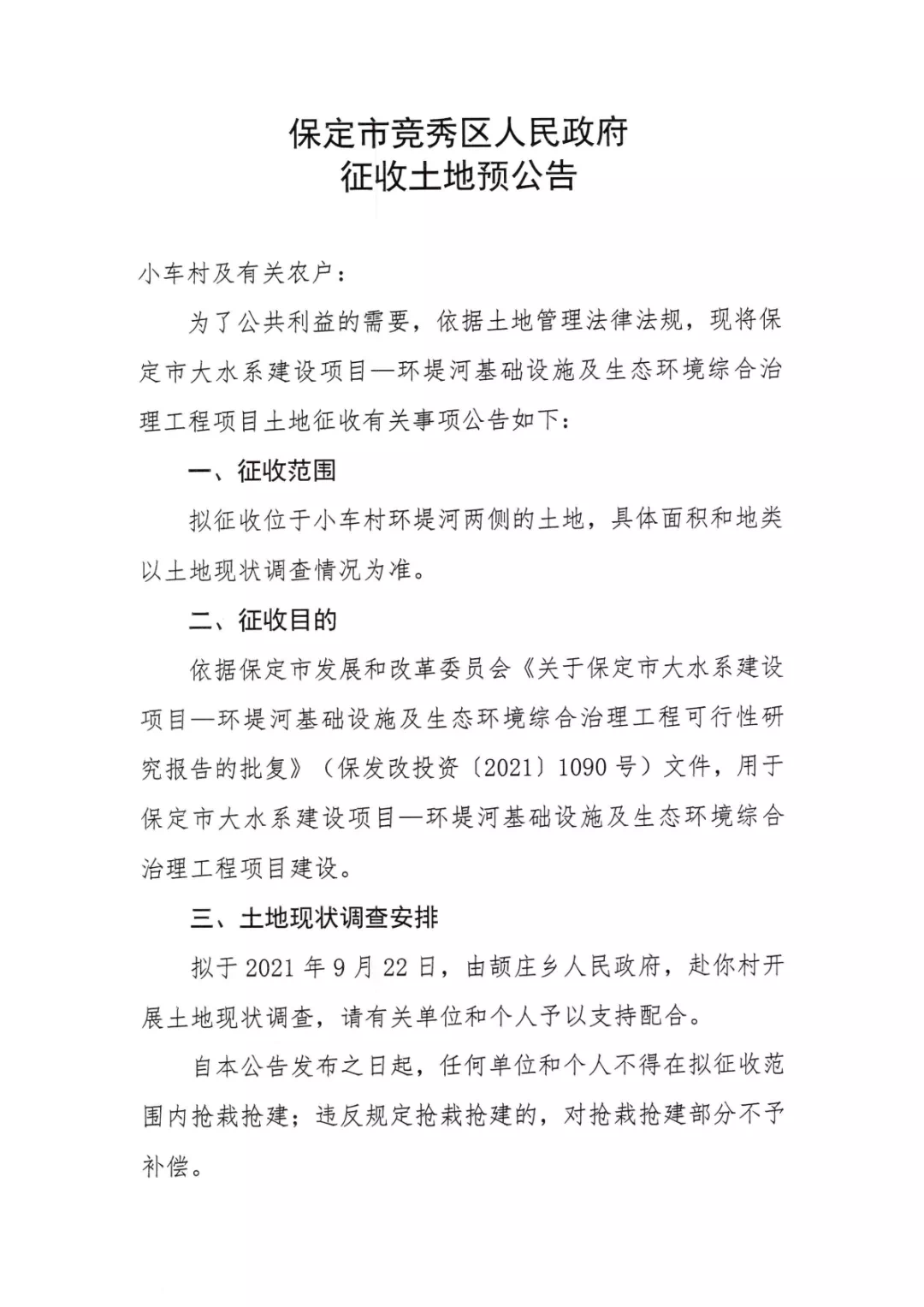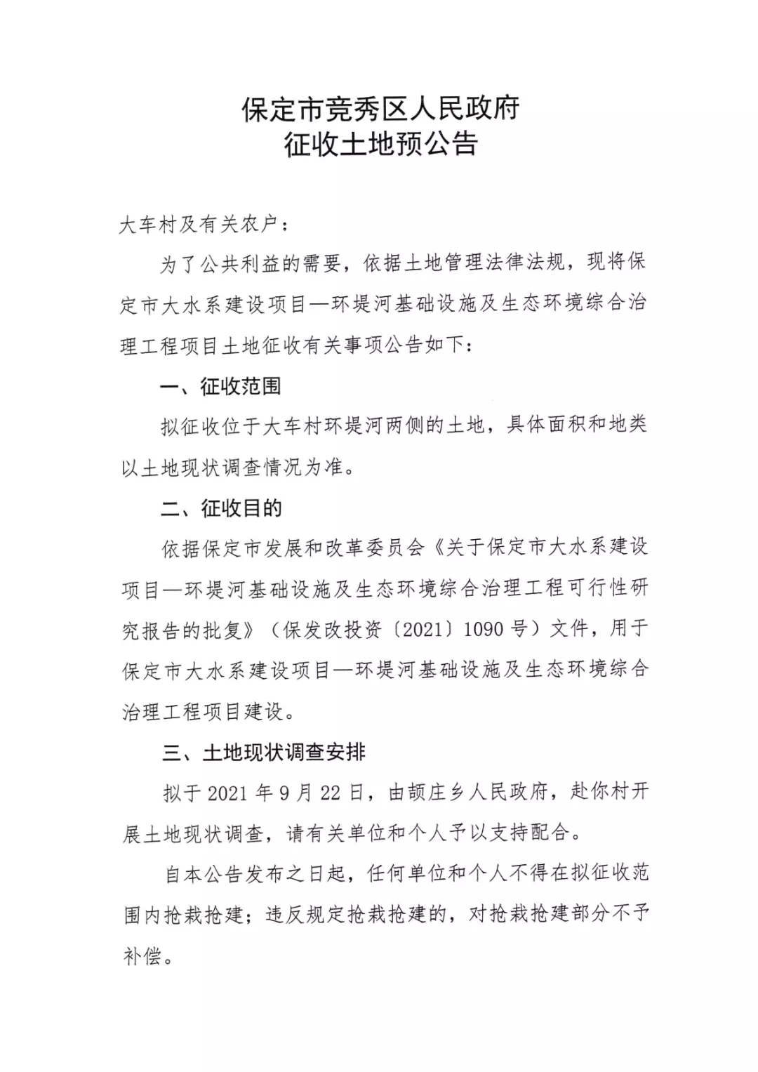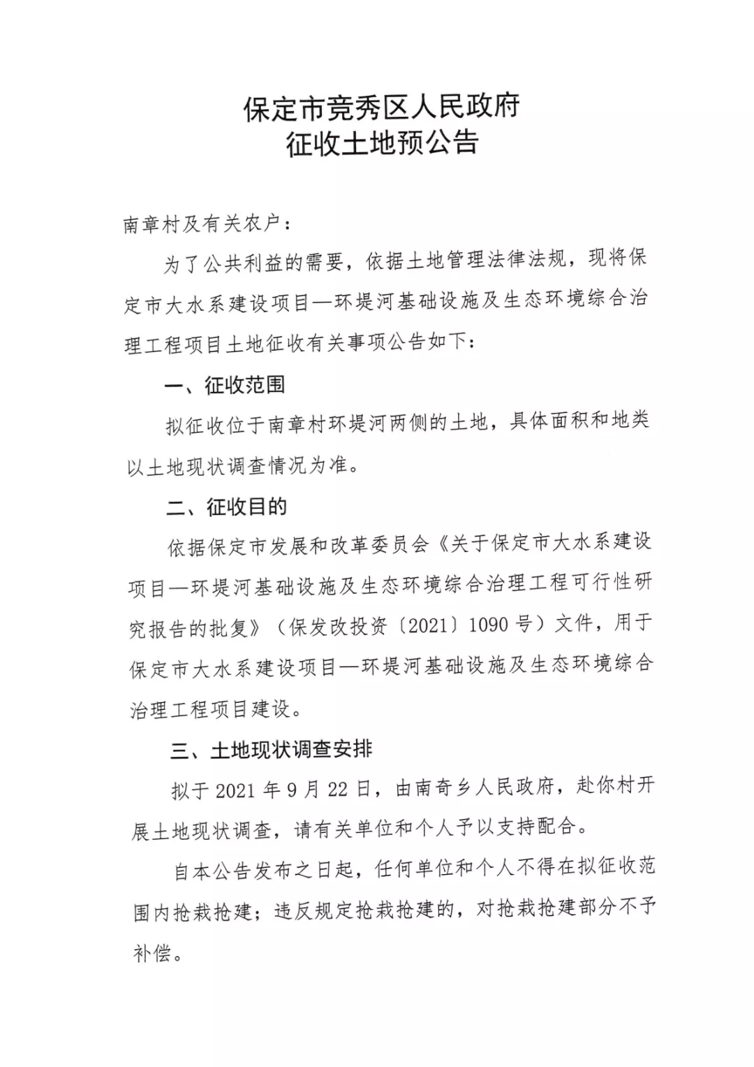 保定竞秀区13村发布征收土地预公告 用于大水系建设项目