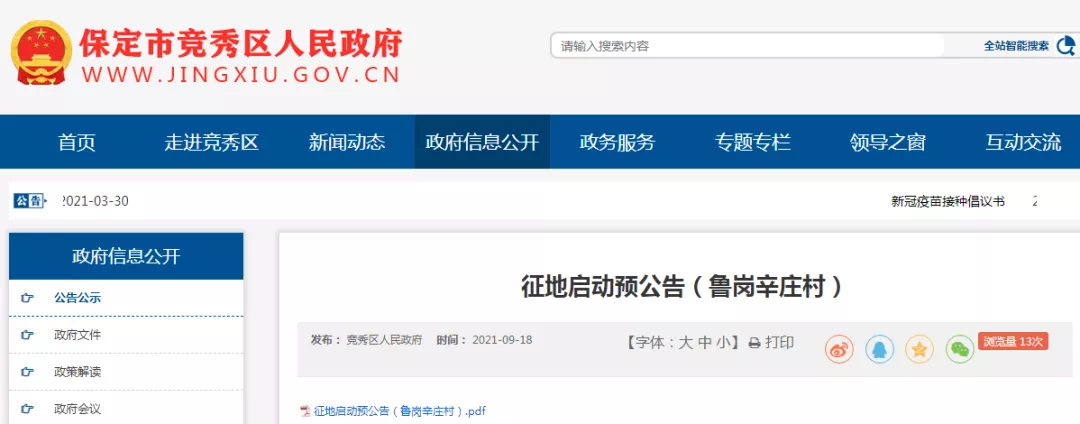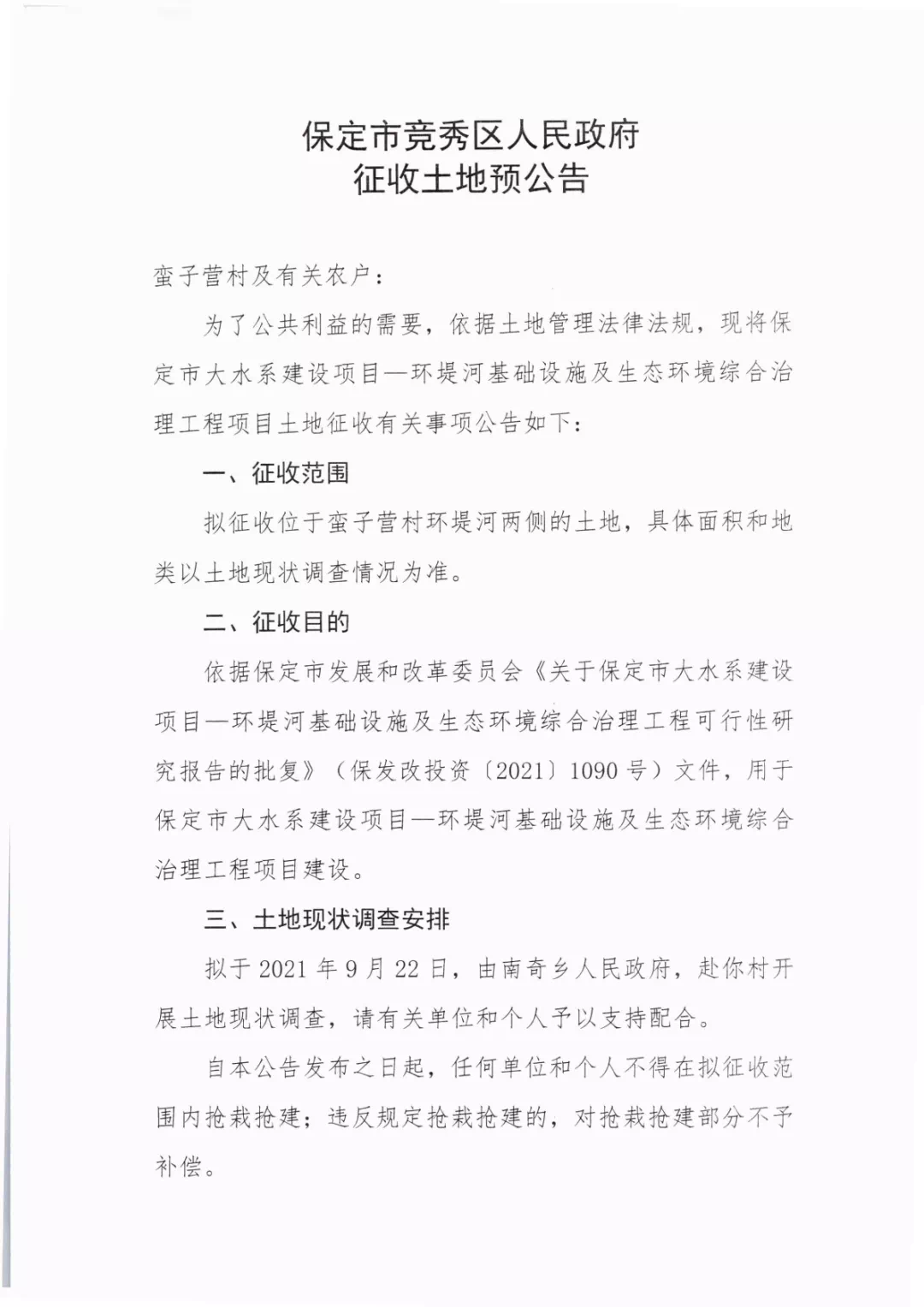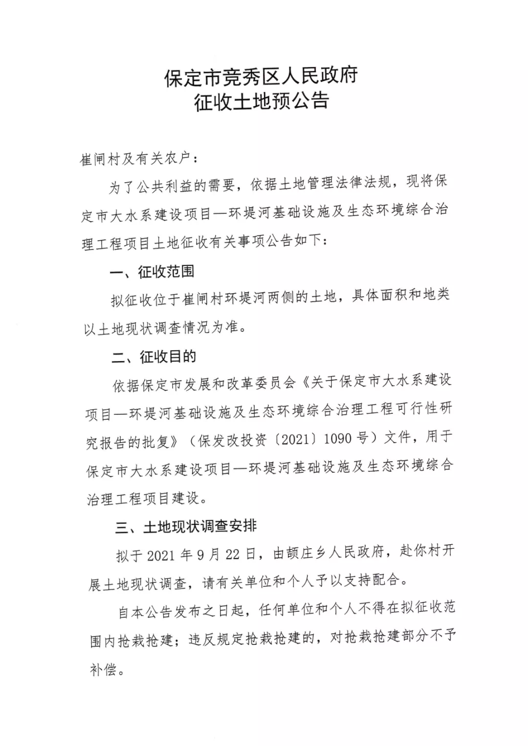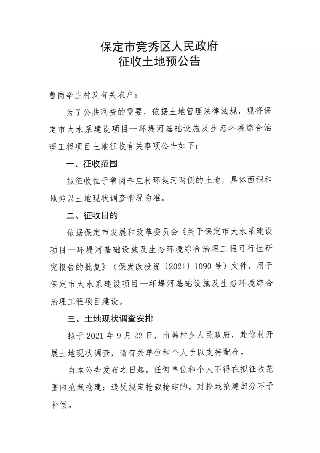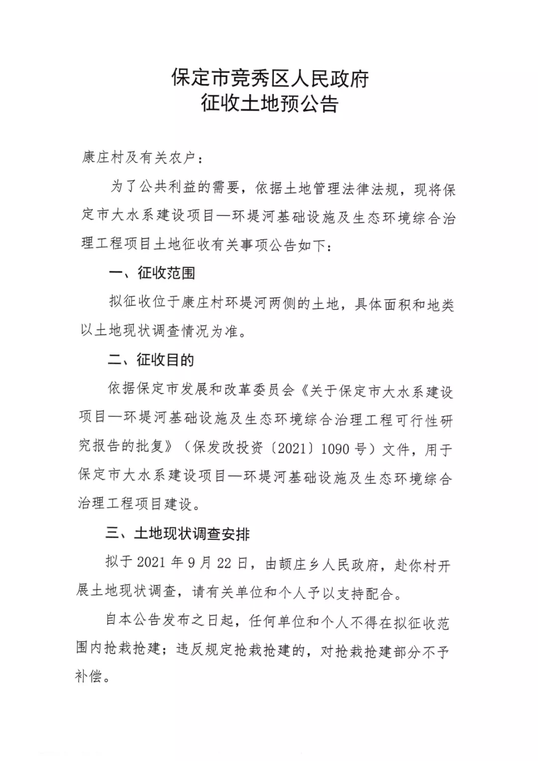 保定竞秀区13村发布征收土地预公告 用于大水系建设项目