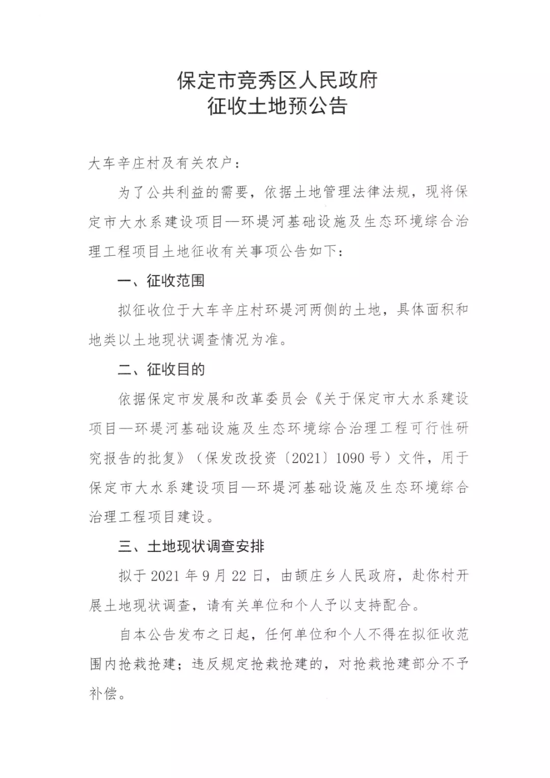 2021年9月18日,保定市竞秀区人民政府官网发布13则征收土地预公告,涉及北章村、崔闸村、大车村、大车辛村、大祝泽、富昌屯村、康庄村、鲁岗辛村、马厂、蛮子营村、南章村、小车村、小汲店村等。征收土地均用于保定市大水系建设项目——环堤河基础设施及生态环境综合治理工程项目。