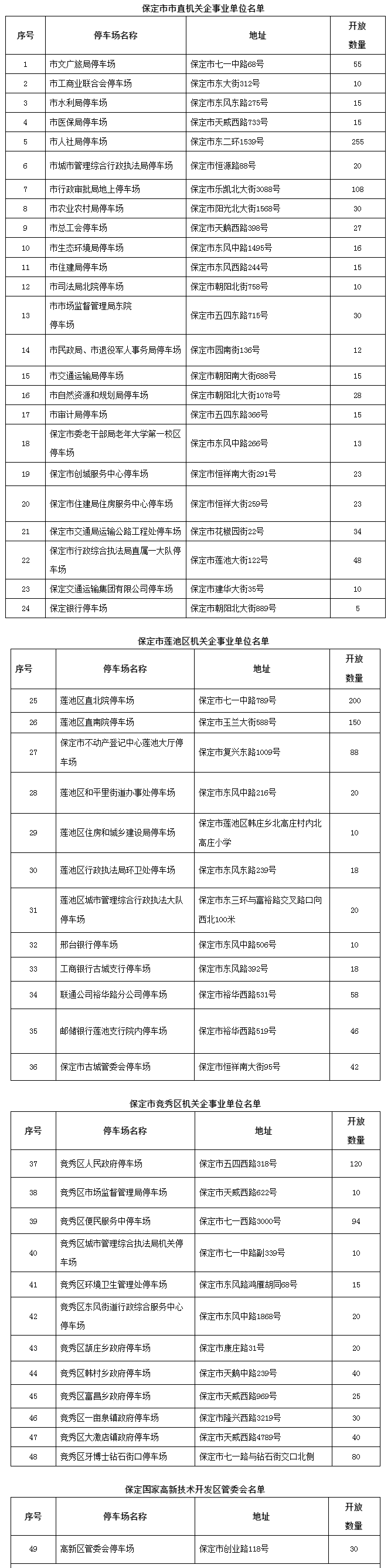 保定市主城区部分机关企事业单位内部停车位面向社会错时免费开放