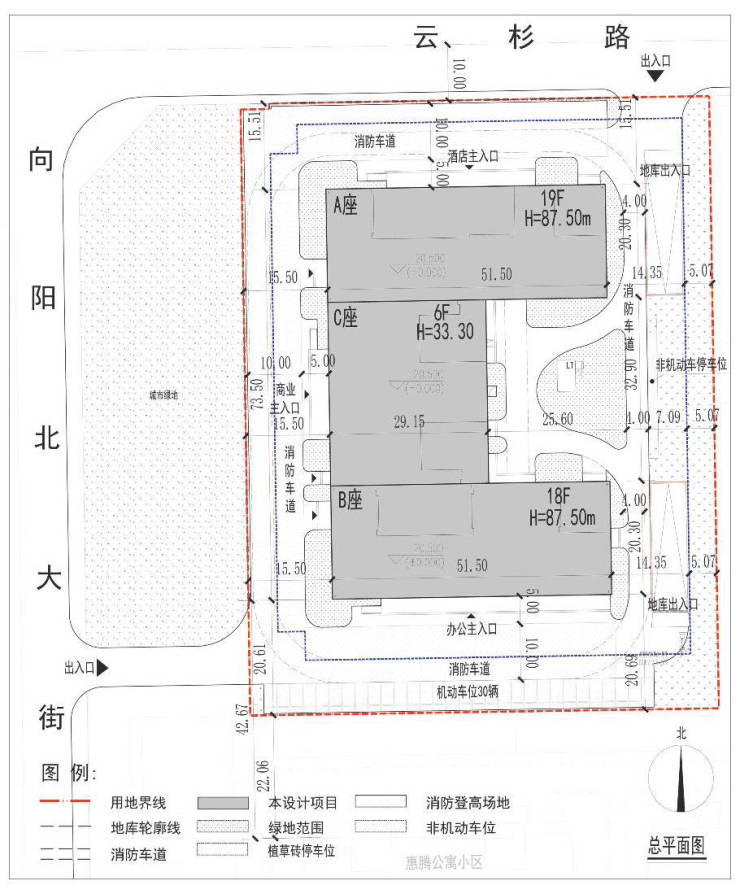 项目位于向阳北大街东侧、云杉路南侧,用地面积9471.30平方米(约14.21亩)规划用地性质为商业服务业设施用地。项目设计方案于2019年4月经保定市城乡规划委员会第一次全体会议审议通过。因相关政策及市场情况变化,拟对原设计方案进行优化:(1)优化建筑功能,将A座业态功能由办公调整为酒店,B座保持办公不变;(2)调整项目层高,B座层数由19层减少为18层;(3)结合平面优化对外立面进行调整,由玻璃幕墙体系调整为窗墙体系;(4)根据《河北省城市停车设施配置及建设导则》结合规划条件调整停车配比,地下车库由三层调整为二层。