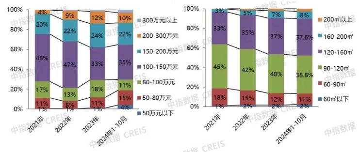 从成交结构来看,2024年1-10月,总价段100-200万、面积段在90-160平之间产品为市场主力,累计成交占比分别为57%和76%。成交总价段,100-150万之间产品成交占比35%,较2023全年增加2.4个百分点,居首位;150-200万之间产品成交占比为22%,较2023全年减少2.1个百分点,居第次席;50-80万之间产品成交占比较2023全年增加4.2个百分点至15%,居第三位;80-100万之间产品成交占比为11%,较2023年减少7.0个百分点;50万以下产品成交占比约为4%,较2023全年增加3.1个百分点;200万以上豪宅项目成交套数占比微降。成交面积段,90-120平之间产品成交占比为38.8%,居首位,但占比延续回落趋势;120-160平之间产品成交套数占比居次席,占比为37.6%,占比小幅增加;90平以下产品成交套数占比约为13%,较去年全年小幅减少;160平以上高端改善产品成交占比约为11%,较2023全年增加0.8个百分点。