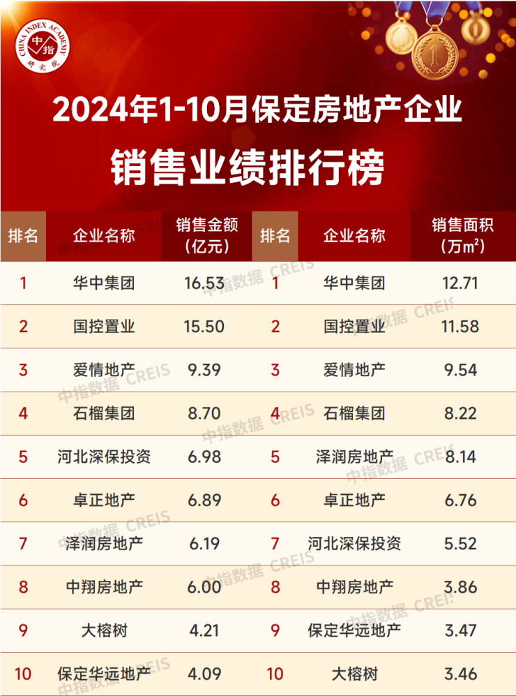 中指院丨2024年1-10月保定房地产企业销售业绩TOP10
