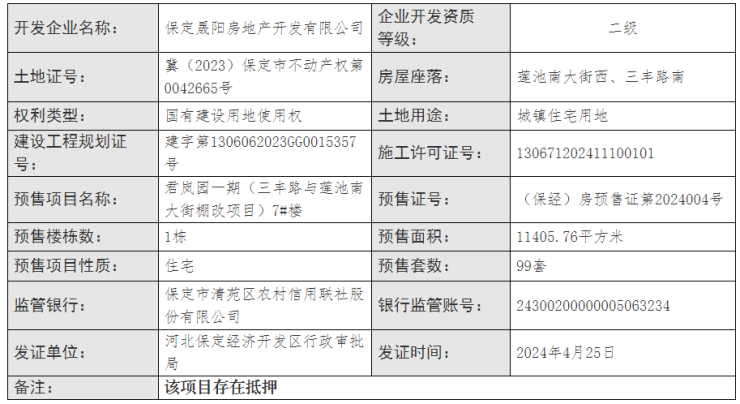 2024年4月25日,河北保定经济开发区行政审批局公布商品房预售许可证办理信息公示,君岚园一期(三丰路与莲池南大街棚改项目)7#楼获预售