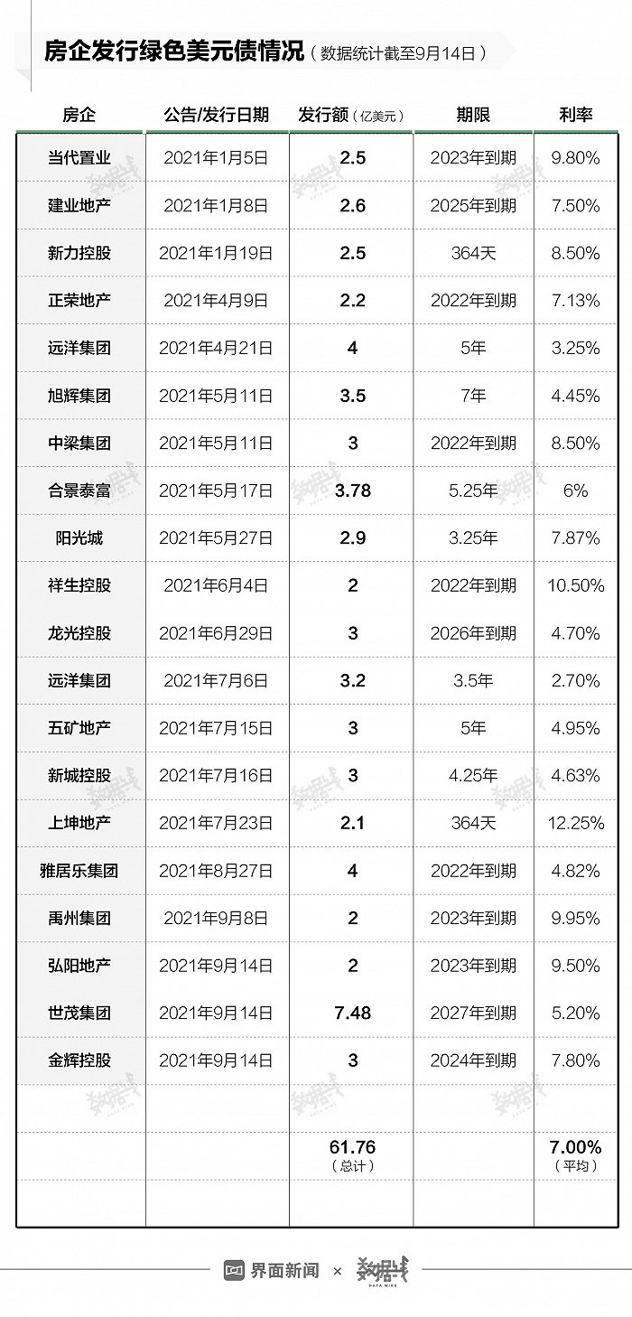 8月份,禹州集团、雅居乐集团纷纷发布公告拟发行绿债。据界面新闻统计,2021年起截至9月14日,共有20家房企发行绿色美元优先票据,合计规模达61.76亿美元,平均票面利率为7%。