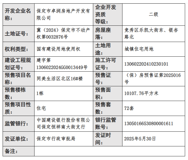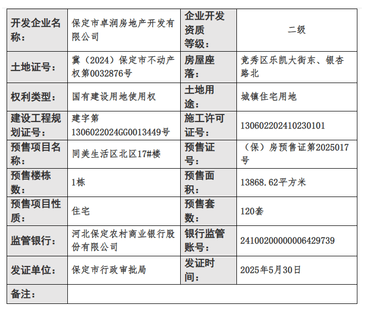 2025年5月30日,保定市行政审批局公布了两则商品房预售许可证下发信息,同美生活区北区16#、17#楼获发预售证,预售套数192套。其中16#预售面积10107.76平方米,预售套数72套,预售证号(保)房预售证第2025016号。17#楼预售面积13868.62平方米,预售套数120套,预售证号(保)房预售证第2025017号