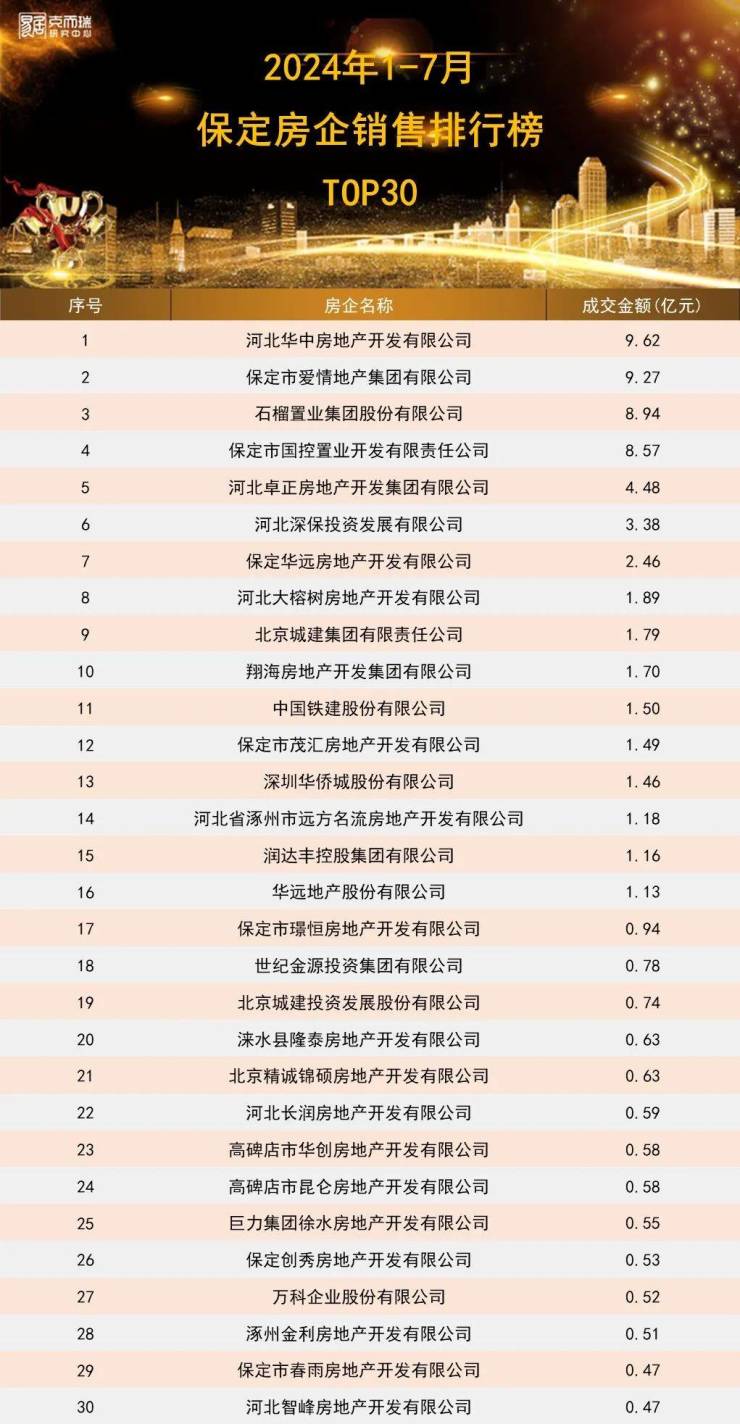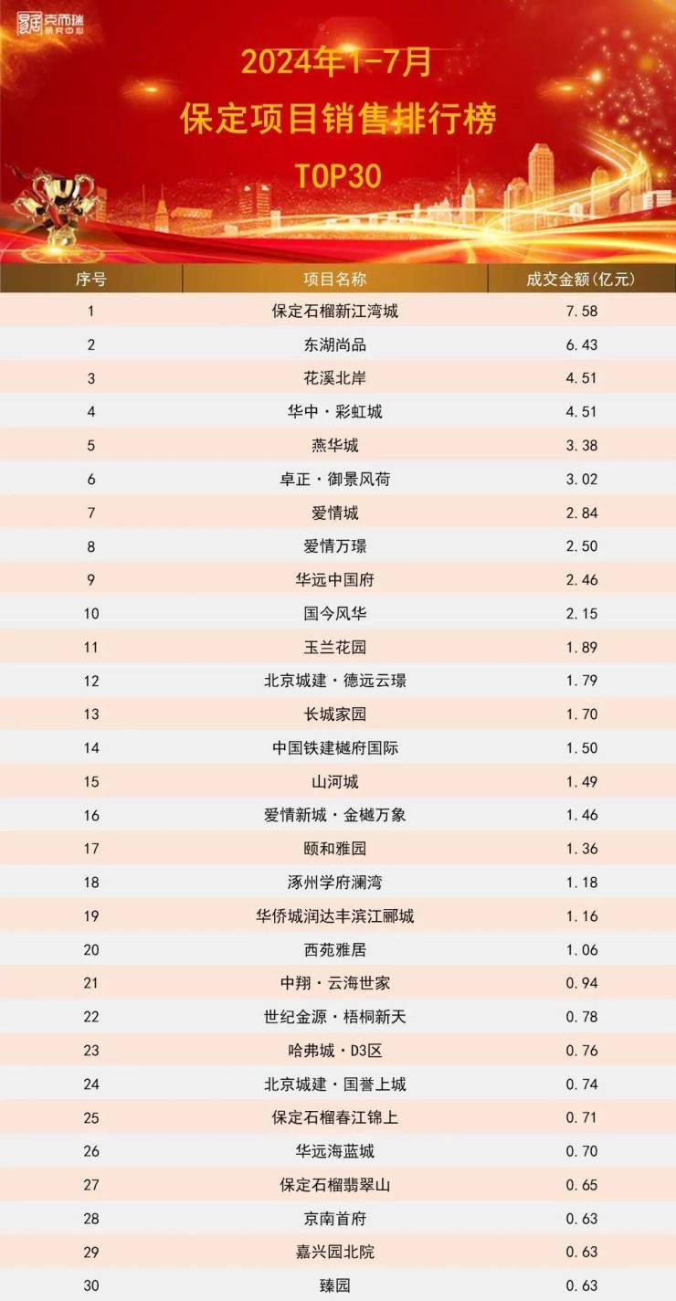 2024年1-7月保定房企&项目排行榜出炉