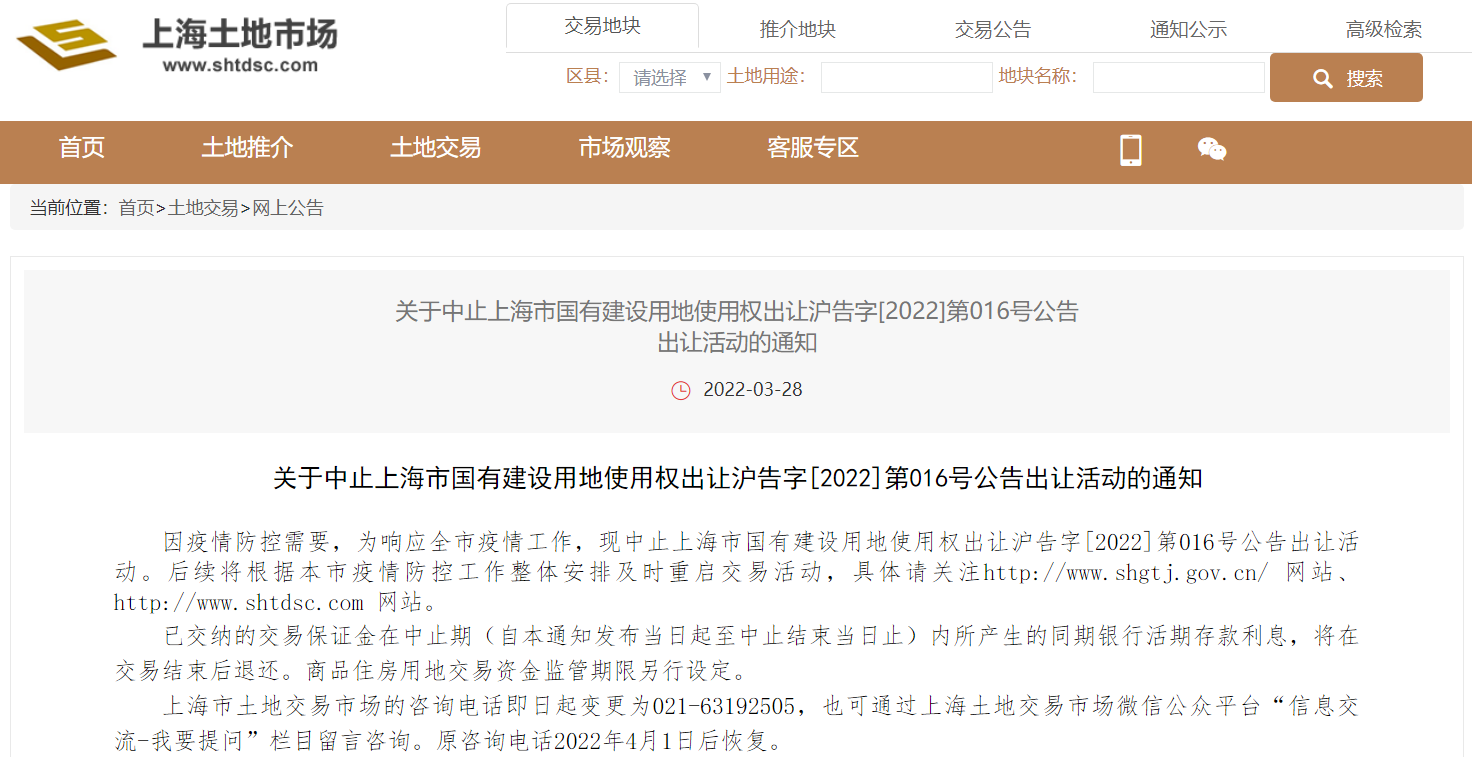3月28日,上海土地市场官网发布《关于中止上海市国有建设用地使用权出让沪告字[2022]第016号公告出让活动的通知》(以下简称《通知》)。