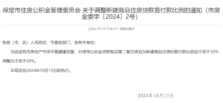 2024年10月15日,保定市住房公积金管理委员会发布调整购房首付款比例的通知。新政策要求使用公积金贷款购买第二套住房的首付款比例提高到20%。