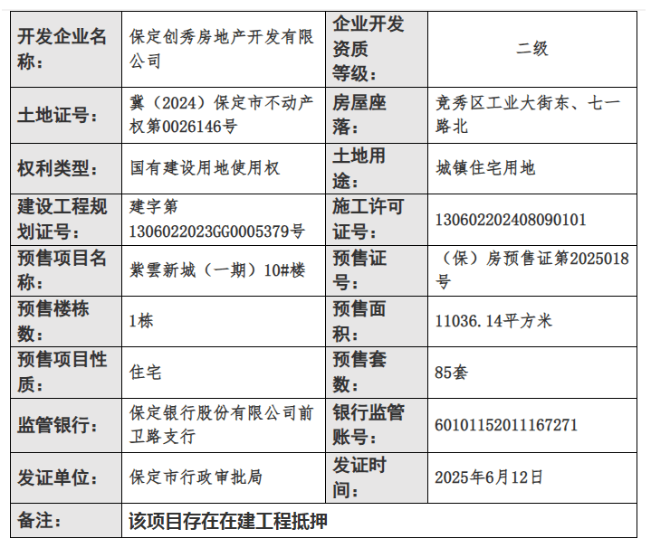 楼商品房获发预售证,预售面积11036.14平方米,预售套数85套,预售证号(保)房预售证第2025018号。