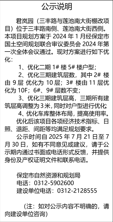 君岚园项目优化方案公示,调整户型、层数、层高及车库布局,满足规划要求,公示期至2025年7月30日。