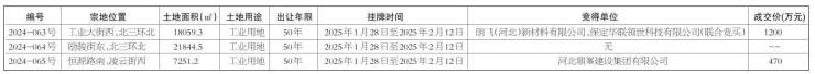 2024-063号地块位于工业大街西、北三环北,土地面积为18059.3㎡。由朗飞(河北)新材料有限公司、保定华联领世科技有限公司(联合竞买),成交价1200万元。2024-065号地块位于恒源路南、凌云街西,土地面积为7251.2㎡,由河北鼎峯建设集团有限公司竞得,成交价470万元。