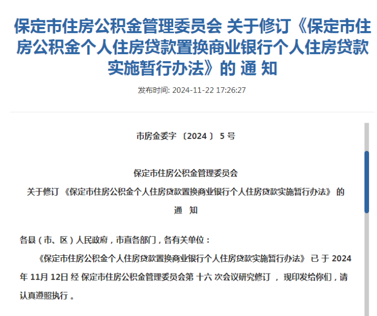 2024年11月22日,保定市住房管理中心发布《保定市住房公积金个人住房贷款置换商业银行个人住房贷款实施暂行办法》,即“商转公贷款”实施细则。