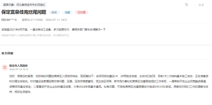近日,就有网友在领导留言板咨询富泉佳苑项目烂尾问题,官方进行了回复。