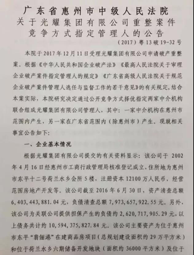 2018年1月4日,惠州市中级人民法院对外发布一则公告称,已于2017年12月11日正式受理光耀集团申请破产重组案。截至2016年6月30日,光耀集团清查资产总额为64.03亿,负债清查总额达79.7亿元,为关联公司提供担保产生的负债约26亿元,债务总额合计近106亿元,处于资不抵债状态。