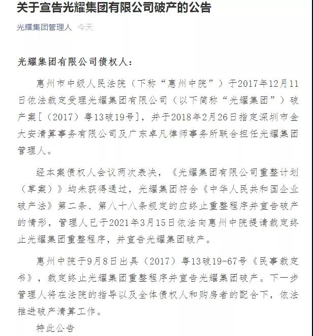 公告显示,惠州中院于2017年12月11日受理了光耀集团的破产案,于今年9月8日裁定终止光耀集团重整程序并宣告光耀集团破产。