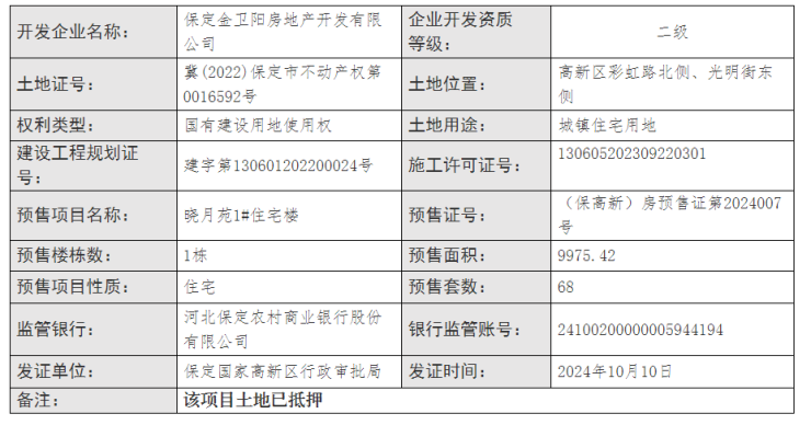 1#楼预售面积9975.42平方米,预售套数68套,预售证号(保高新)房预售证第2024007号。