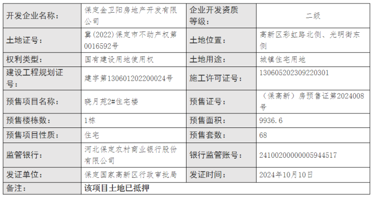 2#楼预售面积9936.6平方米,预售套数68套,预售证号(保高新)房预售证第2024008号。