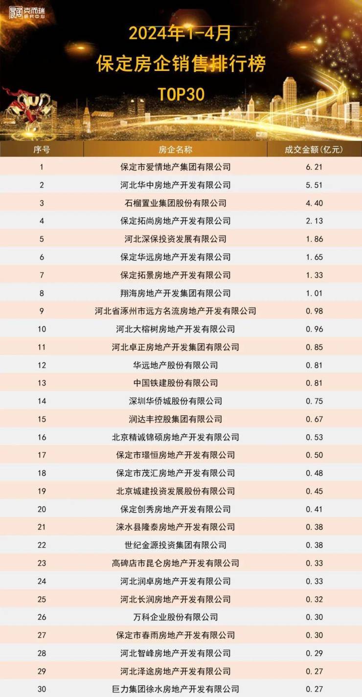 克而瑞数据丨2024年1-4月保定房企&项目排行榜