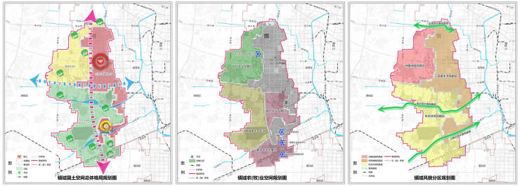 形成“三廊(一亩泉滨水景观廊道、侯河滨水景观廊道、白草沟滨水景观廊道)-三区(品质生活风貌区、生态休闲风貌区、诗画田园风貌区)”的镇域特色风貌结构,构建水、田、城相互嵌入交融的总体风貌格局。