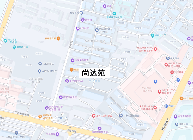 3.尚达苑:小区东至保定市第一中心医院,南至保定市供销合作社,西至双盛街,北至保定宏源房地产开发有限公司。