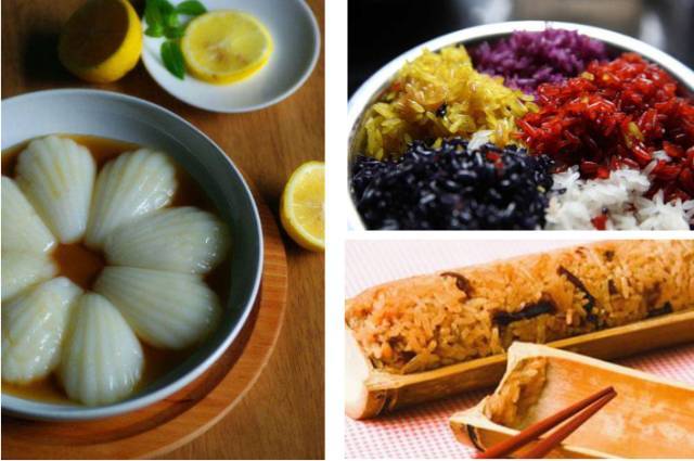 竹筒饭、五色饭、蚵仔煎、琵琶肉、豌豆粉、米凉糕、烤全羊、手抓、荞麦饼、马奶酒、酥油茶、竹筒茶等少数民族美食、美饮