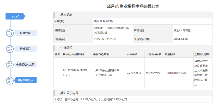 保定金卫阳房地产开发有限公司晓月苑物业招标中标结果公示发布,北京绿城物业管理有限公司保定分公司中标,中标价格2.2元人民币,为一级物业服务标准。其中基础物业费:1.21元/㎡/月,公共能耗费0.99元/㎡/月。