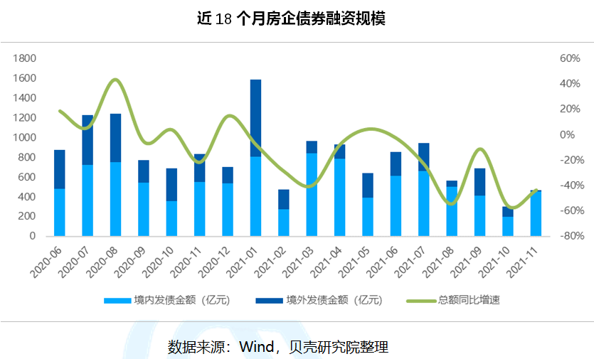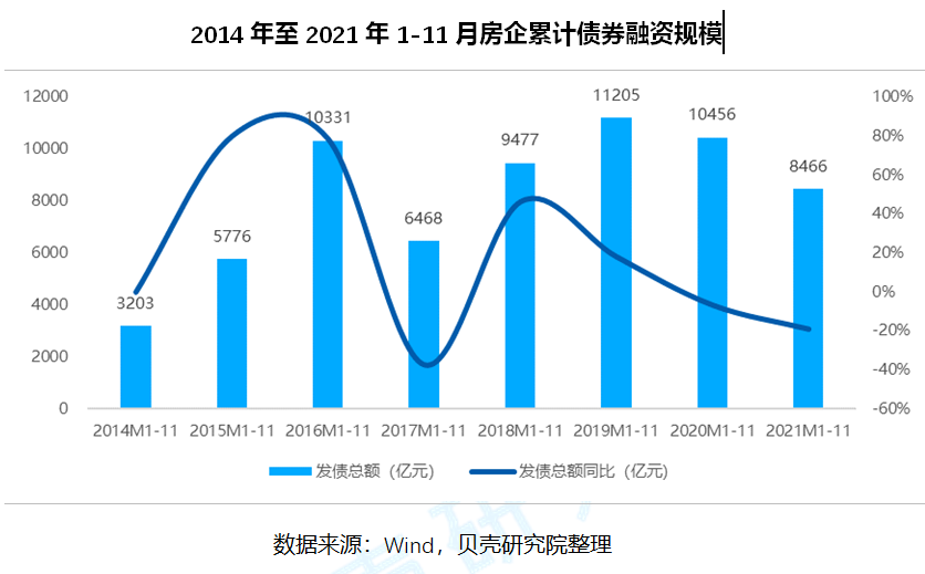贝壳研究院较新统计数据显示,今年前11月,房企境内外债券融资累计约8466亿元,较2020年同期下降19%,规模减少1990亿元。其中,11月单月,境内外债券融资共发行48笔,较上月增加17笔,发行规模折合人民币约473亿元,环比增加55.6%,同比减少43.4%。