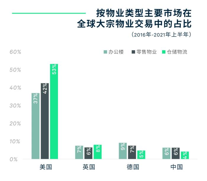 疫情暴发以来,中国国内产业地产投资迅猛发展,在大宗交易金额中的占比目前已经达到15%以上,但与全球平均约25%的比重相比仍有长足的增长潜力。从全球资本配置的角度也能得出相近的结论。根据RCA的数据统计,2016年至今中国的物流地产交易额仅占全球4%;该比例也低于中国办公楼和零售物业在全球大宗交易额的占比。