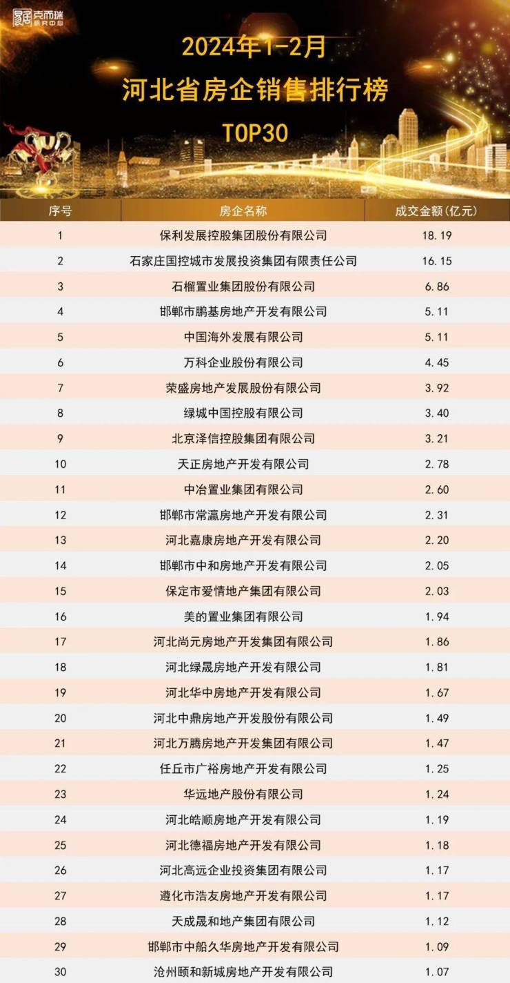 克尔瑞丨2024年1-2月河北省房企&项目TOP30排行榜
