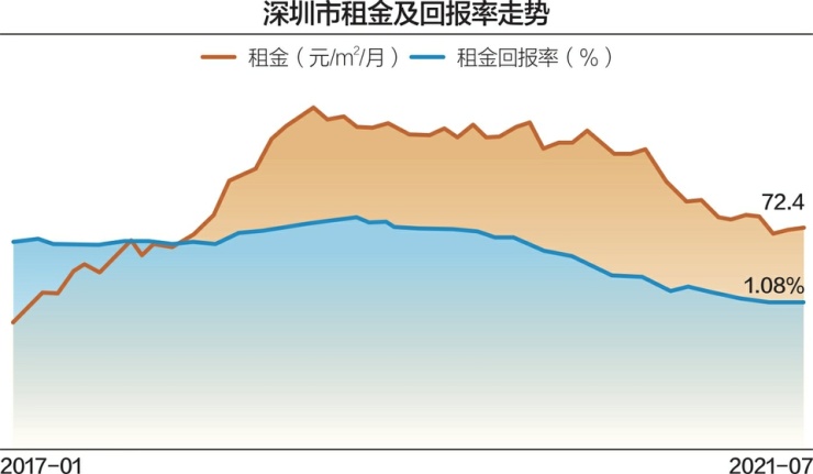 据深圳中原研究中心统计,8月份深圳住宅租金为72.4元/月/平方米,环比上涨0.3%,租金回报率微涨至1.08%。其中,南山区依然是全市租金较高的区域,达112.7元/平方米/月。