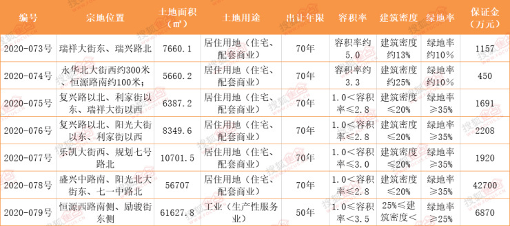 2020-073号地块,位于瑞祥大街东、瑞兴路北,挂牌面积7660.1㎡,约合11.49亩,地块临近丽景华庭。2020-074号地块,位于永华北大街西约300米、恒源路南约100米,挂牌面积5660.2㎡,约合8.49亩,地块临近荣联 天下城。2020-075号地块,位于复兴路以北、利家街以东、瑞祥大街以西,挂牌面积6387.2㎡,约合9.58亩,地块临近千禧园小区。2020-076号地块位于复兴路以北、阳光大街以东、利家街以西,挂牌面积8349.6㎡,约合12.52亩,地块临近利家世纪城。2020-077号地块,位于乐凯大街西、规划七号路北;挂牌面积10701.5㎡,约合16.05亩,地块临近赢佳立源项目。