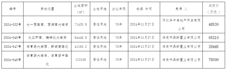 2024年11月27日,保定市公共资源交易中心公布了一则国有建设用地使用权拍卖出让结果公示,主城区4宗居住用地成功出让,华中成功摘得彩虹城西侧2024-032号地块,剩余3宗地块均由鼎新置业摘得。