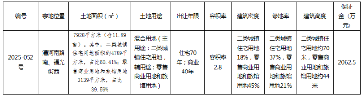 2025-052号地块为混合用地(主用途:二类城镇住宅用地,辅用途:零售商业用地和旅馆用地),拍卖地块面积7928平方米(合11.89亩)。其中,二类城镇住宅用地面积约4789平方米,占比60.41%;零售商业用地和旅馆用地3139平方米,占比39.59%,约11.89亩,容积率为2.8,起始价4125万元。