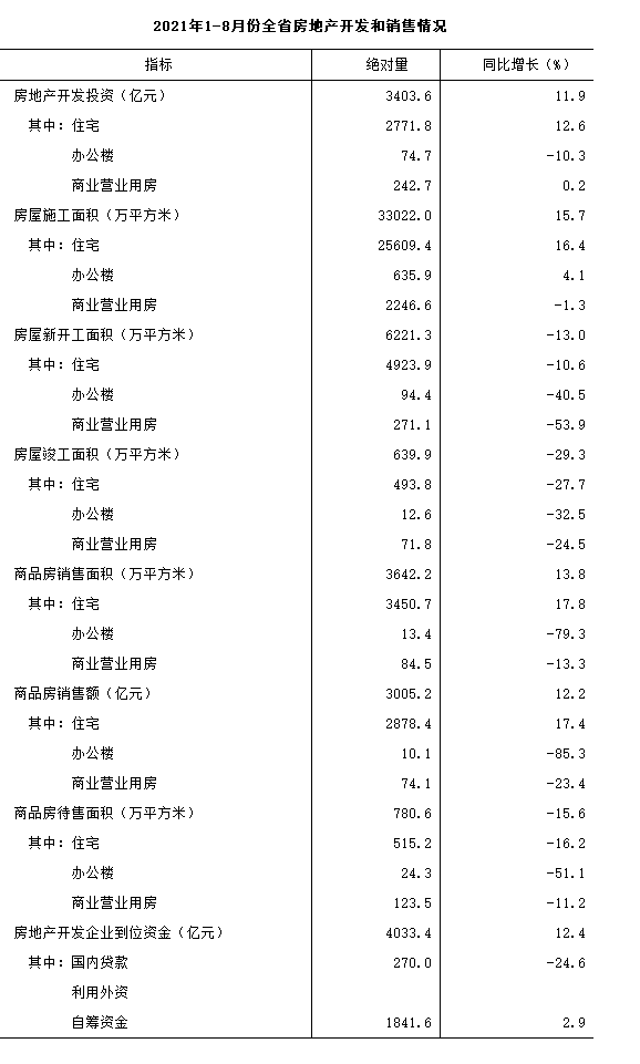 河北省统计局:2021年1-8月份全省房地产开发和销售情况
