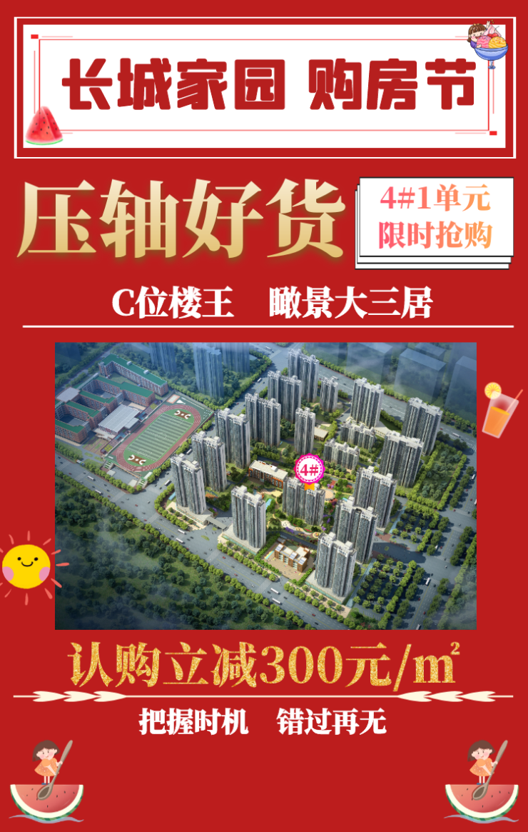 长城家园夏日购房节火爆来袭,震撼全城!4#楼楼王璀璨面市,万众追捧,认购立减300元/㎡;更有特定房源限时推出6.6元抵10000元,优惠“双王炸”,掀起抢房高潮。